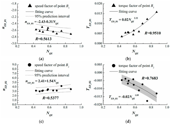 Through the data collection shown in Figure 7, it is found that the variation range of the speed factor of point B1 is small. Because there exists an approximately linear relationship between and —that is, —linear fitting can be used to determine their values, and the short dash lines are the bands of the 95% prediction interval. Due to the impending reverse flow and the pumping effect in the “S”-shaped region [26,41,42], the change of the resistance torque is complex under the operating condition corresponding to point B2. This leads to relatively low correlation coefficients between and (0.7683), and the standard deviations of 0.0029 are provided as shown by the gray strip in Figure 7.