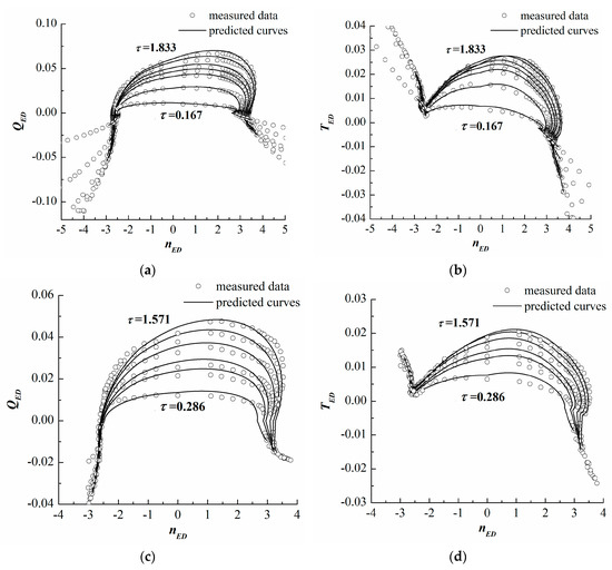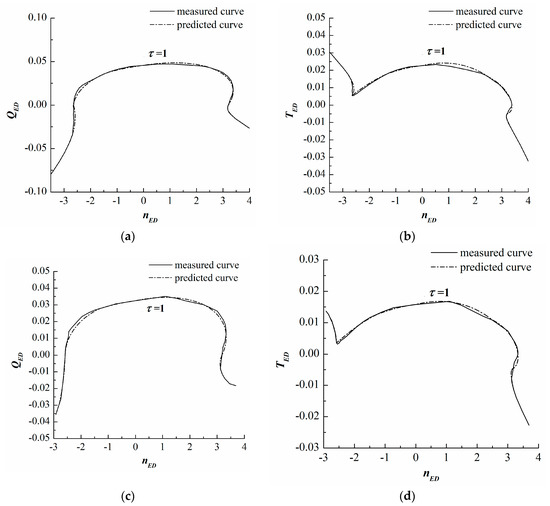 Comparisons of the predicted and measured complete characteristic curves. (a) of the Xianju pump-turbine; (b) of the Xianju pump-turbine; (c) of the Xilongchi pump-turbine; (d) of the Xilongchi pump-turbine.