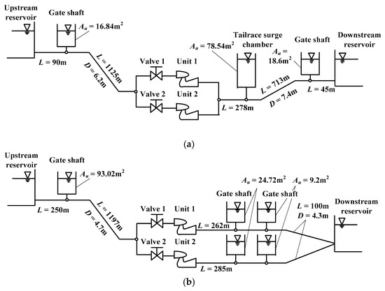 Schematic diagram of piping layout. (a) Xianju PSPP; (b) Xilongchi PSPP.