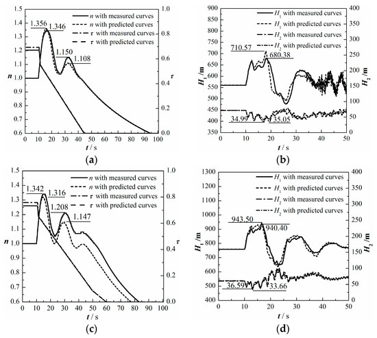 Simulation results of simultaneous load rejection using the predicted characteristics and the measured characteristics. (a) rotational speed of the Xianju pump-turbine; (b) pressure at the spiral case inlet and the draft tube inlet of the Xianju PSPP; (c) rotational speed of the Xilongchi pump-turbine; (d) pressure at the spiral case inlet and the draft tube inlet of the Xilongchi PSPP.