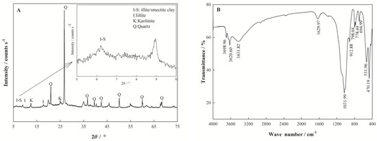 The chemical composition and physicochemical properties of nano I-Sm are presented in Table 1. The XRD patterns of nano I-Sm are given in Figure 1 A. Nano I-Sm is mainly composed of quartz, mixed-layer illite/smectite, illite, and kaolinite, and the characteristic diffraction peak of nano I-Sm was observed between 5 and 10° (2θ) [30]. Furthermore, an FT-IR analysis was applied to identify the functional groups on the nano I-Sm sample’s surface. The FT-IR spectra of the nano I-Sm sample are shown in Figure 1B. The absorption bands at 3698.96 and 3620.60 cm−1 represent the inner surface OH stretching vibration, while the absorption band at 3423.76 cm−1 represents the outer surface OH stretching vibration. These OH groups function as an active site for the binding of positively charged cations. The absorption band at 1629.97 cm−1 represents the OH bending of water retained in the silica matrix [23]. The absorption bands at 1031.99 and 470.19 cm−1 represent the Si–O–Si stretching vibration [31]. The absorption band at 912.4 cm−1 represents the Al–OH bending vibrations [29], while those at 798.04 and 694.4 cm−1 represent the Si–O stretching vibration [23].