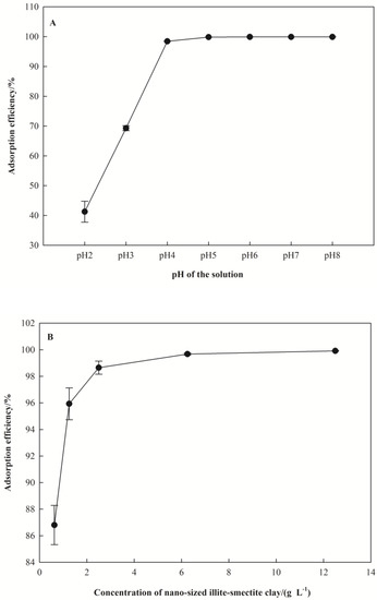 Clay as an adsorbent is widely used for the removal of heavy metals and has great applicability due to its being economical and having an environment-friendly nature, a high adsorption capacity, and a wide pH range [12,13]. In recent years, many kinds of clay, i.e., bentonite, kaolin, and montmorillonite, have been reported for the removal of high-concentration heavy metals from water [13,14,15,16,17]. Illite-smectite (I-Sm) clay is a new mixed mineral of illite and montmorillonite, and a transition mineral from montmorillonite to illite, belonging to the typical 2:1-type layered silicate mineral. In 2014, nearly 30 billion tons of I-Sm mineral was discovered in Shangsi County, Guangxi. Because I-Sm mineral has the characteristics of high purity, fine particles, and a large surface area, I-Sm has been studied for use as a rubber modifier [18] and as an adsorbent to remove high concentrations of heavy metals from aqueous solution [19,20]. Only a few studies have focused on the adsorption of low concentrations of heavy metals in contaminated water using I-Sm.