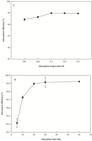 The effect of temperature on Pb(II) removal rate is shown in Figure 3C. It was observed that the removal rate of Pb(II) was 98.44–98.99% when the temperature was set at 298, 308, 313, 323, and 333 K. The trend of the removal rate with the increase of temperature is not obvious.