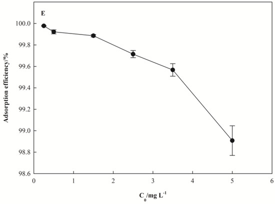 The effect of initial concentration on the removal rate of Pb(II) adsorbed by nano I-Sm is shown in Figure 3E. The removal rate of Pb(II) decreased with the increase of initial Pb(II) concentration. When the initial concentration of Pb(II) increased from 0.25 to 5 mg·L−1, the removal rate of Pb(II) decreased from 99.45% to 98.90%.