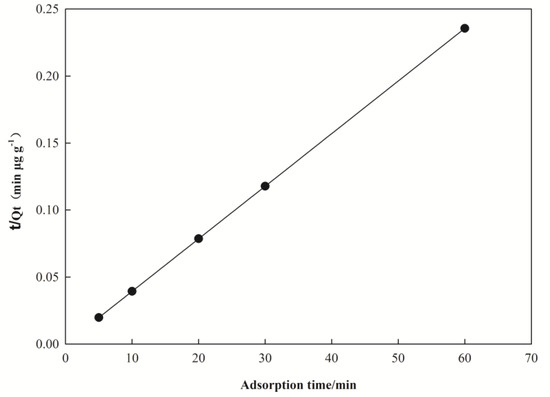 The kinetic of adsorption of Pb(II) on nano I-Sm was fitted by pseudo-first-order and pseudo-second-order kinetic equations. The results are shown in Table 2 and Figure 4. The correlation coefficient of the linear plots of t/Qt against t for the pseudo-first-order model and the pseudo-second-order model was 0.985 and 1, respectively. The Qe of the pseudo-first-order kinetics model was 2.603 μg·g−1, and the Qe of pseudo-second-order dynamic model was 256.410 μg·g−1.
