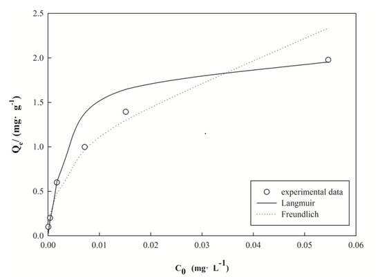 where Qmax is the monolayer capacity of nano I-Sm, mg∙g−1; KL is the Langmuir constant, L∙μg−1; Kf is the Freundlich constant, μg∙g−1; and n is the heterogeneity.