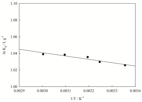 The thermodynamic parameters can be determined using the equilibrium constant and temperature [28,29]. The change in the Gibbs free energy (ΔG), enthalpy (ΔH), and entropy (ΔS) in the adsorption process was calculated using Equations (7) and (8).
