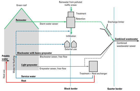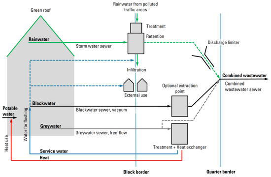 Scheme of the Hamburg Water Cycle (with heat recovery) technical option at the quarter level (based on [31]).