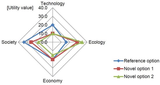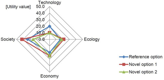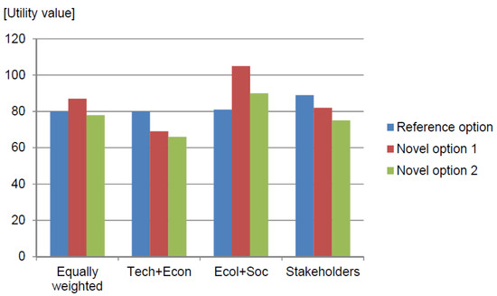 When taking a closer look at the weighting scenarios, it could be seen that with equal weightings novel options had the highest utility value in three cases (model areas B, C, and D) while conventional systems were at the top in two model areas (A and E). The weighting scenario with an emphasis on the technical and economic assessment category resulted in four highest rankings for the conventional options, except in one case (model area D). This was mainly due to the fact that these systems generally perform well regarding the categories technology and economy (e.g., model area A, Figure 5). However, it should be emphasised that novel water infrastructure options have consistently prevailed over conventional options within the technological category in terms of flexibility and adaptability, as well as their synergy potential with other infrastructures and within the economic category in terms of revenue, long-term competitiveness or innovation leadership and the ability of system change (Supplementary Table S1). The higher valuation of conventional options was mainly due to the fact that they were considered to have a lower need for adaptation concerning existing infrastructures.
