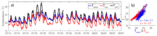 Comparison of the calculated surface temperature (T) and two temperatures measured using DTS (T and T) can be seen in Figure 3a. At night, T followed the measured water temperature (T); however, during the day, T reached on average 0.6 K higher values than T. Average temperature of T and T over the whole measurement period was 23.3 °C and 23.0 °C, respectively. Average measured T reached only 20.6 °C. This might suggest that T is a better approximation of the surface temperature than T. However, T followed the variation of T and the amplitude of its diurnal change almost exactly, with an offset of 2.7 K. The minimum temperature (T) measured proved to be well correlated with the surface temperature (T) calculated from outgoing longwave radiation measurements for the Delft location using Equation (4). The offset of 2.7 K is well in the accuracy range of the pyrgometer that recorded the outgoing longwave radiation used for the calculation of the surface temperature. Figure 3b shows a scatter plot of the calculated surface temperature (y-axis) and T and T. Correlation coefficients of T and the two temperatures measured using DTS were 0.86 for T and 0.68 for T.