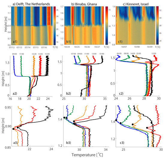 Temperature profiles of water–air interface in time for three measurement locations: (a) Delft, (b) Binaba, and (c) Kinneret. Subplots (1) show the instantaneous temperature profiles for all time steps. Note the different temperature scales. Subplots (2) show five chosen time steps during one day for each location. The chosen days were 15 July 2014 for Delft, 25 October 2011 for Binaba, and 7 October 2011 for Kinneret, local times are shown above each profile. Subplots (3) show the same chosen time steps but are zoomed in on the water surface (black dot).