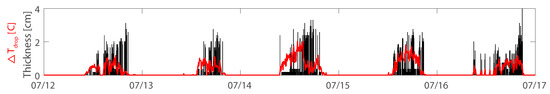 When using fiber optic cable for near water surface measurements, one needs to be aware of its tendency to absorb solar radiation, despite its white colour. This effect can be partly visible in Figure 1a and Figure 4c3, where the DTS is measuring higher temperature just below the surface compared to the air temperature. The effect of radiation on DTS measurements in air and water close to the water surface was described in [32] and [6], respectively. Nonetheless, even with this effect, skin is still detected, but it may, on some occasions, appear thicker due to the way the thickness is defined.