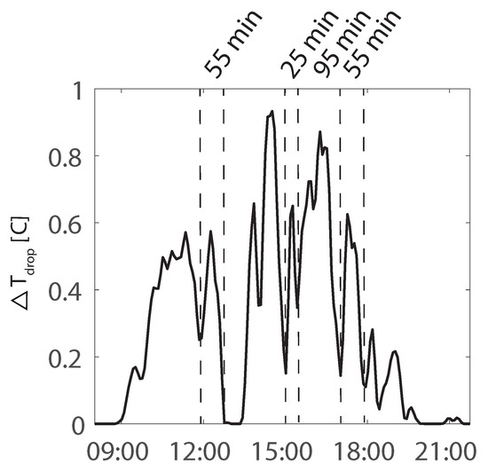 Time series of the temperature drop (T) on 12 July 2014 in Delft.