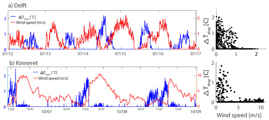 Size of the temperature drop (T) in relation to wind speed for measurements in (a) Delft, and (b) Kinneret.