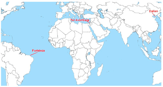 Four metropolitan regions were chosen due to their location in semi-arid regions that suffer the negative effects of climate change, and also because they have a population of several million people: Fortaleza, Brazil; Tel Aviv/Gaza, Israel/Palestine; and Dalian, China. The rivers used for drinking water were the Parnaiba in Brazil; the Nile in Egypt, and the Huanghe in China. All intakes were allocated at the mouths of their rivers. Two scenarios were calculated for water demand: (1) scenario 200 L per capita per day; and (2) scenario 81 L per capita per day. The data of the metropolitan regions and characteristics of rivers are in Table 1 and Table 2.