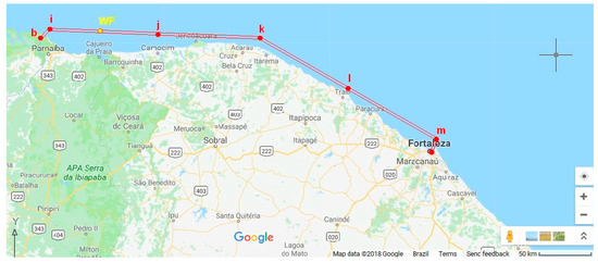 - Google Maps. Parnaíba-Fortaleza. 2018. Available online: https://www.google.com.br/maps/@-3.4282533,-40.8341481,7.99z?hl=pt-BR (accessed on 10 January 2018).