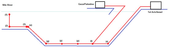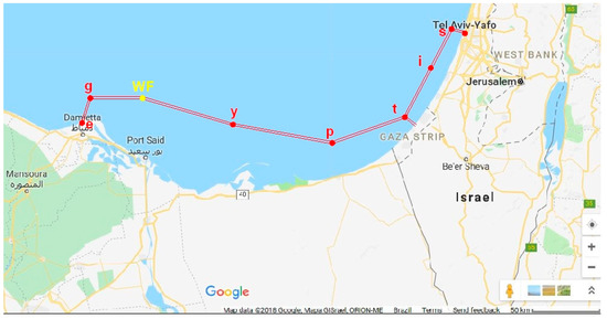 Location of the pipeline Nile/Tel Aviv, Israel and Gaza-Palestine; letters in bold mean pumping units. WF is the location of the wind power plant. Map source: [48].