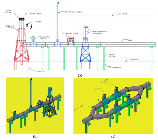 According to [44], at the mouth of the Rio Parnaíba, the TDS ranged between 29 and 30 mg/L, so the pipeline intake was allocated 1000 m inside the mouth. The authors in [45] reported that at the bifurcation between the branches Damietta and Rosetta of the Nile (approximately 150 km from the coast) the TDS ranged between 179 and 259 mg/L, so the system admission was allocated 30 km inside the Rosetta branch. Reference [46] estimated that the Practical Salinity Unit (PSU) of the Huanghe at 30 km from the mouth varied between 0.1 and 0.2 PSU, which is approximately equivalent to a TDS of 100 to 200 mg/L, so the system was allocated 30 km inside the mouth of the Huanghe.