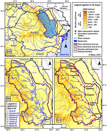 The Siret basin has the following coordinates: northern limit—47°58′ N; southern limit—45°28′ N; western limit—24°49′ E; eastern limit—28°2′ E. The level difference between the sources and the discharge mouth is 1236 m. The catchment is typically asymmetrical, because it was created on the right (Carpathian Mts. sector), on the basis of mountainous tributaries [2]. The hydrographical network includes the Siret River and its main tributaries, which spring from the mountainous area: Siretul Mic (on the Ukrainian territory), Suceava, Moldova, Bistrita, Trotus, Putna, Ramnicu Sarat, and Buzau. The only important tributary on the left is Barlad (Figure 2b).