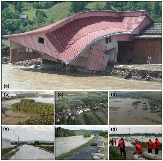 Damage caused by floods within the Siret catchment in the summer of the year 2010: (a) houses damaged by the flood on Moldovita, left tributary of the Moldova River (Suceava basin); (b) Siret flooded north from the city of Bacau; (c) Siret flooded in the Saucesti commune (Bacau County); (d) localities, arable land, and infrastructure affected by the floods in the middle sector of the Siret River; (e) Roads affected by floods in the lower sector of the Siret River; (f) Temporary dams that were resistant to the floods on the Siret River; (g) Intervention of employees with the Inspectorate for Emergency Situations, Bacau.