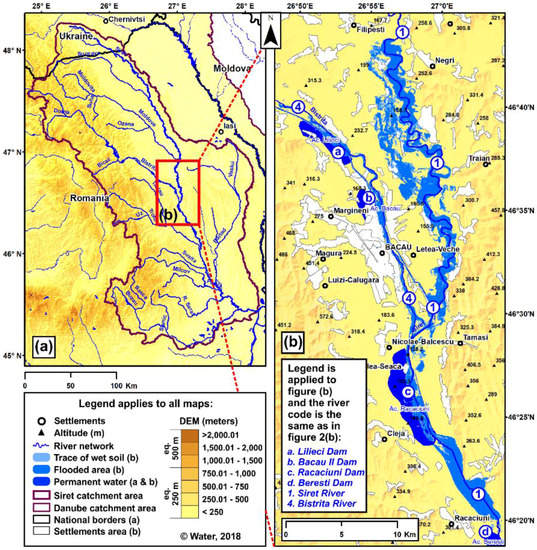 (a) Geographic location of the flood events (26 June to 5 July 2010) within the Siret catchment area; (b) historical flood on the Siret River extracted from LANDSAT TM and LANDSAT ETM+ scenes from 3 July 2010.