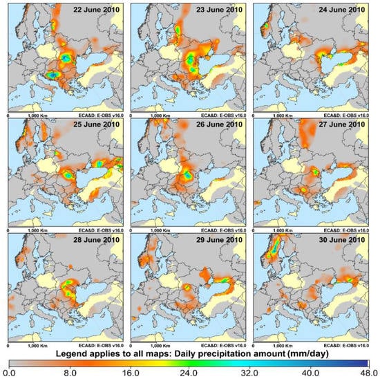 Daily precipitation amounts (mm/day) between 22 and 30 June 2010 in Central-Eastern Europe, based on daily gridded observational dataset (termed E-OBS v16.0).