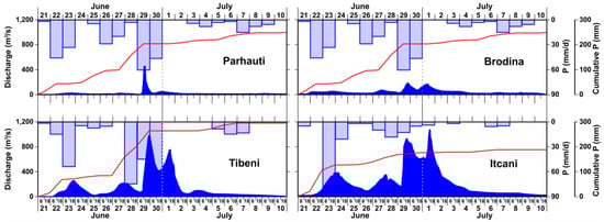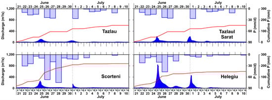 The most important flood waves within the first stage (with two peaks) were recorded at the following hydrometric stations: Itcani (364 m3/s) and Tibeni (266 m3/s) on the Suceava River (Figure 6); and Roman (500 m3/s), Tupilati (460 m3/s), and Gura Humorului (296 m3/s) on the Moldova River (Figure 7). Punctual flood waves also occurred on the smaller tributaries within the two basins. In the second stage, flood waves were stronger, and they featured two peaks: Itcani (883 m3/s) and Tibeni (973.2 m3/s) on the Suceava River (Figure 6); and Roman (870 m3/s), Tupilati (660 m3/s), and Gura Humorului (620 m3/s) on the Moldova River (Figure 7).