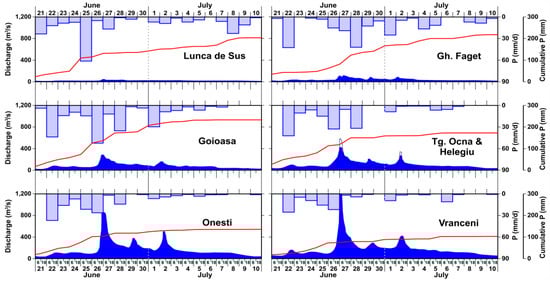 Hydrograph of flood waves and daily intensity of precipitation between 21 June and 10 July 2010, recorded at the hydrometric stations on the Trotus River.