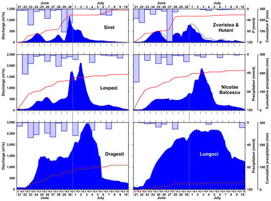 Hydrograph of flood waves and daily intensity of precipitation between 21 June and 10 July 2010, recorded at the hydrometric stations on the Siret River.
