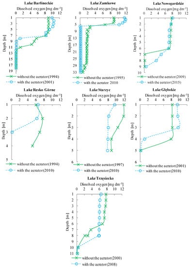 Multiannual study of seven eutrophic lakes that underwent restoration by means of pulverising aeration did not show changes in oxygen conditions of the bottom waters in either stratified or unstratified lakes. The two stratified lakes, as well as two of the unstratified lakes under analysis, showed mean DO in the bottom waters < 1mg dm−3 in summer throughout the study period. This indicates hypoxia, with a threshold concentration value of dissolved oxygen 2 mg dm−3 [32]. The oxygen profiles presented in this paper show that oxygen conditions were improved in the surface layers of the three lakes, and that in the two unstratified lakes, the conditions deteriorated throughout the profile. Only a few authors have unequivocally confirmed the efficiency of aeration of the bottom waters [14,19,26,33], e.g., by means of side stream saturation [24]. The high efficiency of this method was confirmed in a shallow drinking water reservoir (maximal depth = 9.3 m) where concentration of dissolved oxygen was found to increase. Most authors conducting research on the effects of hypolimnion aeration found no sustainable improvement in oxygen conditions in the analysed lakes. Hypolimnion oxygenation conducted in five stratified lakes in Denmark over a period of 4 to 20 years resulted in a significant increase in hypolimnetic oxygen level in only one lake—the remaining four lakes still exhibited low mean levels in summer (<2.2 mgO2 dm−3) [21].