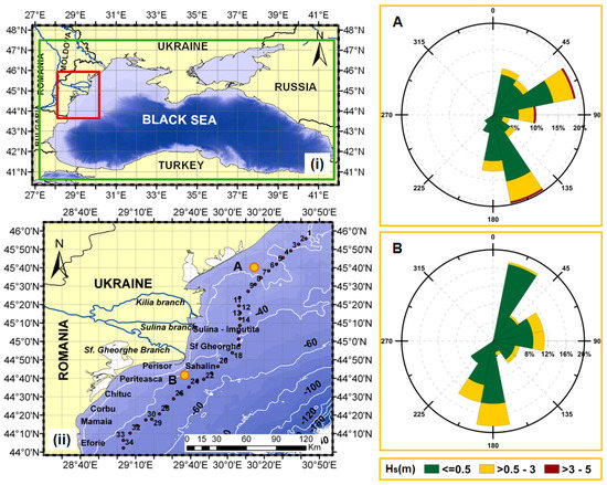 (i) Map of the Black Sea. The computational domain for the Simulating WAves Nearshore (SWAN) model is enclosed by a green rectangle (see first step of the proposed methodology), whereas the northwestern Black Sea is enclosed by a red rectangle (see the second step of the same methodology). (ii) Map of the northwestern Black Sea. Nodes from the statistical model are in red and are numbered from north to south. The right figure shows wave-roses at points A and B (orange dots) from the map of the northwestern Black Sea [29]. The bar on the right-bottom shows the wave height-ranges at the wave-rose.