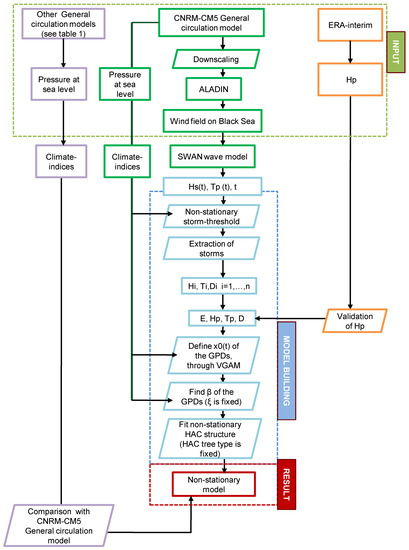 The proposed hybrid methodology (See Figure 2) consists of four stages: (i) Wave-projections at the Black Sea generated with a process-based model; (ii) set-up of a multivariate non-stationary statistical model; (iii) validation of the non-stationary statistical model; (iv) comparison of the obtained wave-storm components with those derived from other general circulation models. The same methodology was applied for each climate change scenario (RCP 4.5 and RCP 8.5).