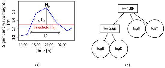 (a) Schematic view of the definition of a wave-storm. The blue thick line represents a wave, the red thin line represents a wave-storm threshold of value . (b) Hierarchical Archimedean copula (HAC)-structure-tree at node 13, in the period 2001–2050, under the RCP4.5 scenario. The circles contain the names of the storm components, which are bound together by a dependence-parameter, written in the rectangles (). This HAC-structure-tree comes from the stationary statistical model. It is representative of all nodes, at each time-window of 50 years and in both emission scenarios. Then, it is selected to represent the dependence-structure of the whole non-stationary statistical model.