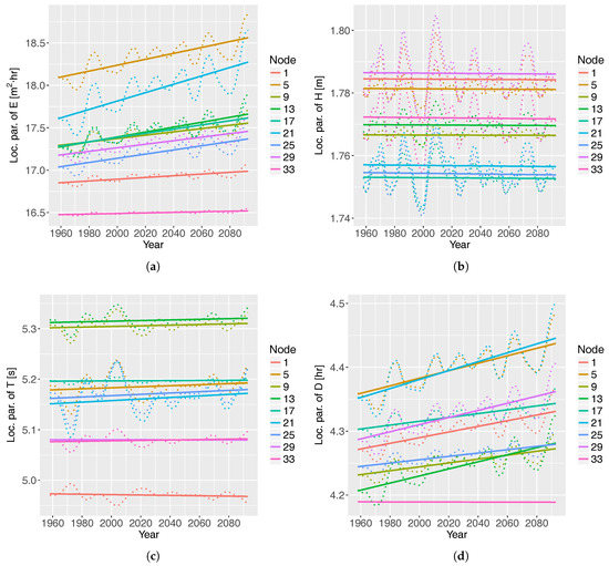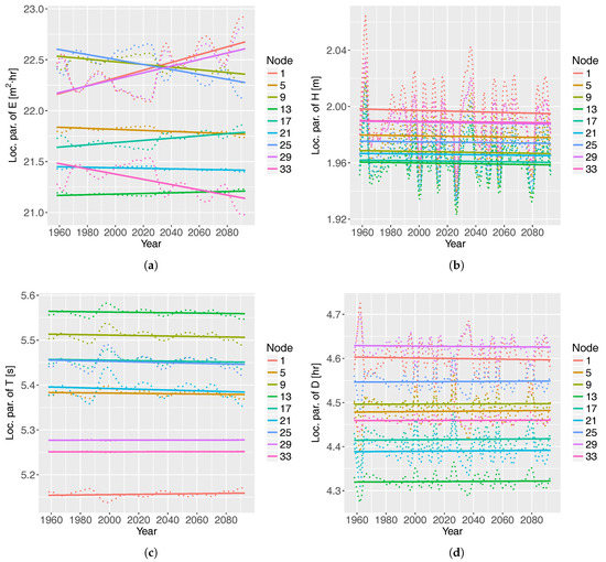 The location parameters of the GPD under RCP4.5 are shown in Figure 4. A selection of nine out of thirty-four nodes are represented. There is an upward trend of the location parameter of E and D, while the location parameter of and has a constant value. The averaged value (in natural values) at nodes 13 and 29 of the mean of E, , , and D are 144.2 m/h, 2.7 m, 6.6 s, and 33.0 h. The assumption in Equation (4) is fulfilled, because the shape parameter is negative. The most influential covariates on the GPD location parameter are EA for E () and D (), the first time-derivative of NAO for () and SC for (). The ratio between the wave-storm component and the climate index is 35 in the case of E and of the order of magnitude of 1 in the rest of the wave-storm components.