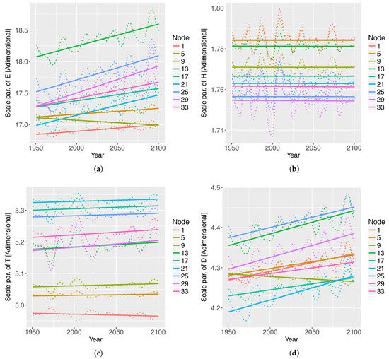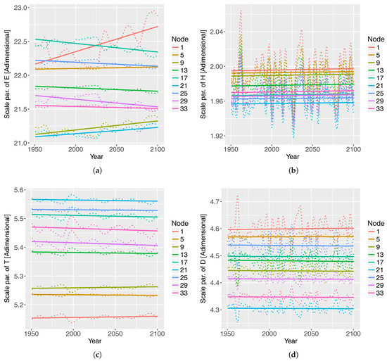 Scale parameter of the GPD that models (a) E, (b) , (c) , and (d) D at selected nodes, under the RCP8.5 scenario. The SC was used in the VGAM to predict the scale parameter of . The EA was used in the VGAM to predict the scale parameter . The first time-derivative of SC was used in the VGAM to predict the scale parameter of D. The scale parameter of E is not affected by the selected climate indices. The time series are approximated by a straight line, which helps to see the trend of the scale parameter at each case.