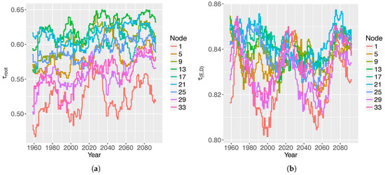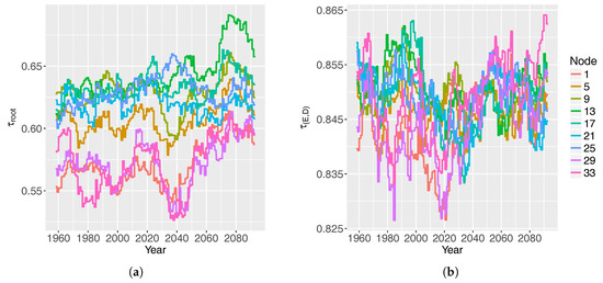 The Gumbel-type HAC is suitable for the proposed statistical model under RCP8.5. It has significantly good graphical fit between empirical and theoretical HAC, while is over at each level of the HAC. The null hypothesis of stationarity of the s cannot be rejected in of the cases, in each HAC, according to the KPSS test. Therefore, the use of pseudo-non-stationary HACs is suitable. The values of Kendall’s are shown in Figure 9. ranges between and , and has a positive trend at all nodes. ranges between and , and presents cyclical fluctuations. The non-stationary statistical model is validated for 1979–2016, as both the Aitchison and Kullback–Leibler measures (Equations 6 and 7) are below .