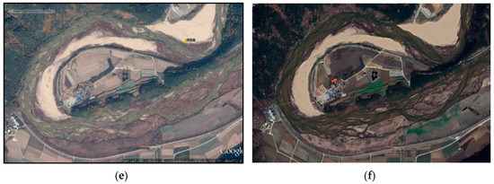Computational domain (dark brown area: vegetation area). [39]. (a) Sep. in 2003 year; (b) Sep. in 2004 year; (c) Feb. in 2005 year; (d) Nov. in 2013 year; (e) Nov. in 2015 year; (f) Apr. in 2016 year.