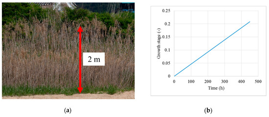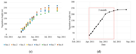 Vegetation species and growth stage. (a) Sample of reed; (b) growth stage (simulation time: 450h); (c) measured vegetation growth; (d) averaged data from measured data; Sec. is the measured section in Seokchon, Korea [45].