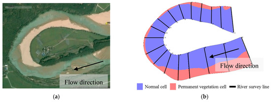 The growth of vegetation plays many diverse roles in river environments beyond simply disturbing the flood flow path. In particular, it influences sediment transport patterns. Several researchers have described the effects of vegetation on sediment transport, which contributes to the deformation of a riverbed [1,2,3]. Several experiments [4,5,6,7,8], numerical simulations [9,10,11], and field studies [12,13,14,15] have shown that vegetation influences changes in channel flow and sediment transport.