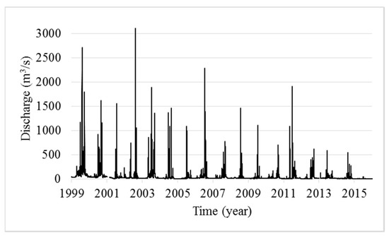 - Flood events, with the annual maximum peak, were selected from 15 years of measurement data (see Figure 4), except for the 2015, as the hydrograph for this year shows less than half of the annual averaged maximum discharge (690 m3/s) of the other years. Thus, a total of 14 hydrographs were extracted from 15 years’ data;