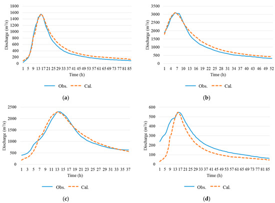 Comparison of observed and calculated flow discharge (Obs: observed discharge; Cal: reproduced discharge using hydrograph characteristic shape with peak discharge). (a) Flood event in 2001; (b) flood event in 2002; (c) flood event in 2006; (d) flood event in 2014.