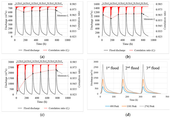 Figure 6a–c shows the temporal changes in the autocorrelation ratio ( and Figure 6d shows the hydrograph characteristic shapes with the three different peaks. In Figure 6a–c, the correlation ratio ( becomes minimum when peak discharge occurs. We found that the amplitude of variations of becomes mostly stable after the three flood events. In Figure 6c (EF case), the amplitude is still decreasing after the third flood event, but the slope of change becomes suddenly milder. It indicates that those bed shapes can be assumed to reach the periodically quasi-equilibrium state. The results imply that the hydrograph including three flood events will cause no serious problems to consider the effects of vegetation.