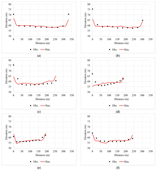 The final simulated channel shape was compared with observed data to verify the model. For these simulation results, a standard hydrograph (see Figure 3) with peak discharge of a 1381 m3/s was used. The verification case did not consider the growing vegetation in order to reflect the environment of the present study area. Figure 7 shows the simulated and observed bed elevation of the grid cross sections (the end of the downstream grid is at i = 319). The number of measurement points was 11. Figure 7a,b show a comparison of the observed and simulated cross sections located at a part of the inlet straight channel. Figure 7c–f shows the observed and simulated bed elevations along grid cross sections at the meandering part. The bed elevation near the inner bank is higher than that near the outer bank, because point bar is developed near the inner bank. Moreover, secondary flow of the first kind occurs and erodes the river bed near the outer bank during flood event such that the bed elevation near the outer bank is lower.