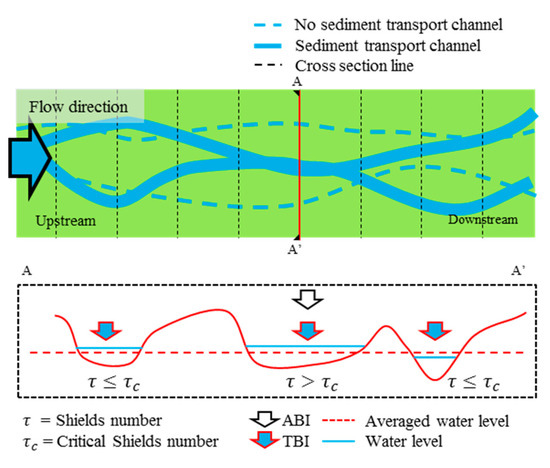The braiding index is a useful indicator for evaluating the magnitude of channel braiding. This index has been studied using two different methods [58]. One method considers the total sinuosity, while the other method considers the channel count. In this study, the channel count method proposed by Bertoldi, et al. [59] was used as it calculates the braiding index simply and intuitively. This method employs the total braiding index (TBI) and the active braiding index (ABI). Essentially, the TBI counts the total number of channels at each cross section as shown in Figure 8, while the ABI counts only the active channels (channels with a Shields number larger than the critical Shields number). Compared with the ABI, the use of the TBI is insufficient to explain the state of spatial sediment transport. Therefore, this study uses the ABI to quantify changes in the channel pattern. If the ABI is large, the river has many thread channels, while if the ABI is small, the river has few channels; a river with an ABI of 1 has only an active single channel.