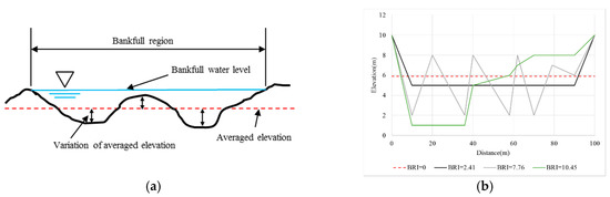 Concept of BRI. (a) Concept of BRI on the cross section; (b) diverse BRI cases on the cross sections at the same average elevation (5.9 m).