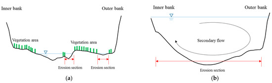 In this study, two types of erosion are defined: Local erosion and global erosion. Local erosion is caused by increased flow velocity near areas of vegetation [61], as shown in Figure 10a. This local erosion often increases in several channel threads when water level is lower as a flood event recedes. Global erosion is caused by secondary flow of the first kind during bankfull discharge. If the flow discharge grows large enough and the channel shape is curved, the strength of the secondary flow becomes substantial, as shown in Figure 10b.