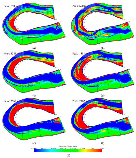 The final channel patterns are shown in Figure 11, which shows the change in the elevation (m) from the initial flat-bed condition, with a constant initial slope of 0.0015. The ranges are limited within ±0.5 m to clearly express the shifting channel patterns. In all cases shown in Figure 11, the point bar is well developed by flood discharge. Note that in these figures, the area just downstream of the inlet maybe affected by the inlet boundary condition. Therefore, the analysis should be carried out in all areas except in this area.