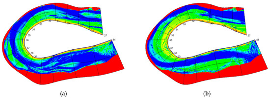 However, if the peak discharge is extreme (2762 m3/s), the effect of the vegetation changes. In this case, global erosion is dominant as the discharge reaches its peak. As a result, the thalweg readily shifts toward the outer bank, so that the unsubmerged area on the point bar increases and the vegetation area expands along the larger point bar. If vegetation expands sufficiently, this area can easily limit the scale of secondary flow [36], because the flow velocity decreases along the vegetation. Therefore, global erosion is activated within the unvegetated areas, such as the thalweg, and the growing vegetation case in Figure 14c shows a shallow thalweg near the outer bank. Consequently, the change in BRI over time is smaller than that of the no-growing vegetation case.