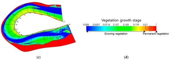In the river basin, the growth of vegetation can be influenced by diverse factors, such as the duration of daylight, water flow, and temperature. This means that, for the purposes of this study, it is necessary to simplify the growth factor such that it directly relates the vegetation growth to water flow. We assumed that vegetation begins to grow during the flood season (June to August) and we set the simulation time as 450 h. The time of vegetation growth was 3 months, so that we assumed that the growth stage linearly increases and then reaches a value of 0.2 (Figure 2b) at the end of the simulation (450 h/3 month = 0.21). The decay process of the vegetation is assumed to change depending on the change in the river bed elevation with respect to the root length. As the length of a reed root is approximately 0.8 m (root growth is neglected), it was assumed that a river bed erosion more than 0.8 m eliminates the vegetation in that area, after which the growth stage () becomes 0.