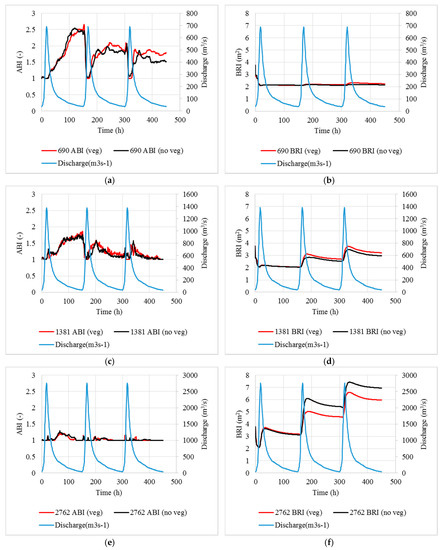 Clearly, the ABI and BRI are altered by the effects of vegetation for different degrees of flow discharge. For a small discharge (690 m3/s), the vegetation acts to accelerate local erosion [11,61,63], which increases the ABI. Similarly, if the peak discharge is low (690 m3/s), the BRI increases slightly over time due to local erosion of the vegetation area, whereas if the peak discharge is high (1381 m3/s), the BRI increases significantly for the higher discharge and vegetation effects, which accelerates both local and global erosion.